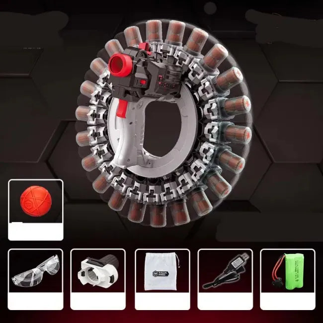 - High-Quality Components: Our set features a durable plastic blaster gun, a 500mA rechargeable lithium battery, a USB charging cable, safety goggles, 22 magazines (each loading 3 darts), and 72 red PU round darts.