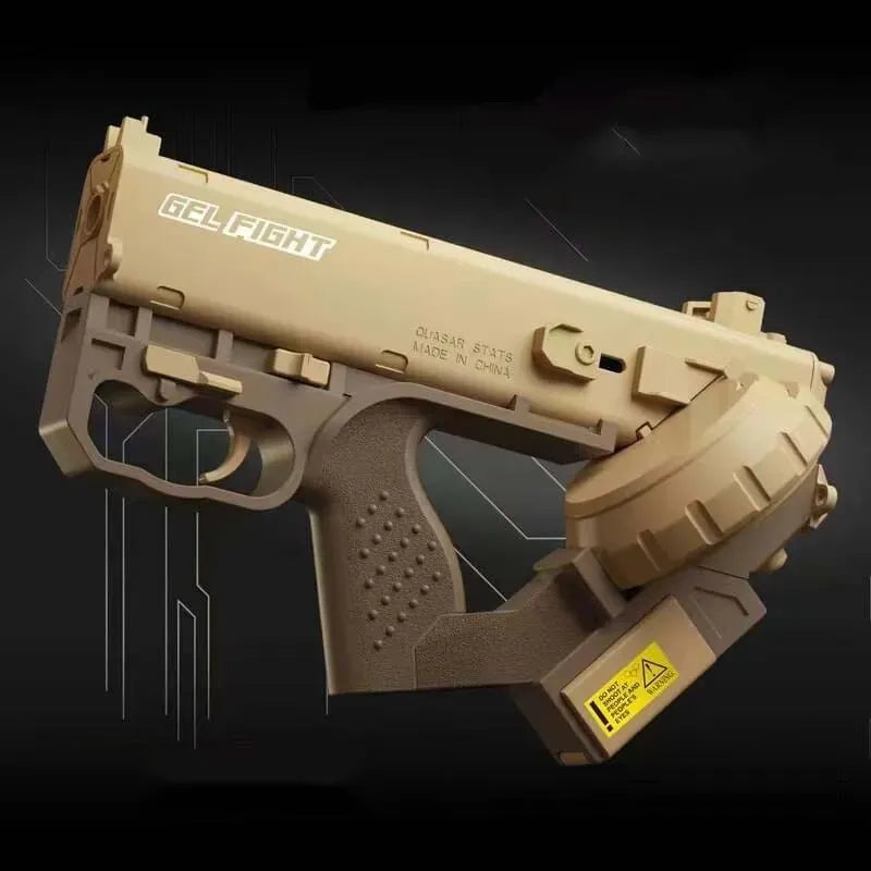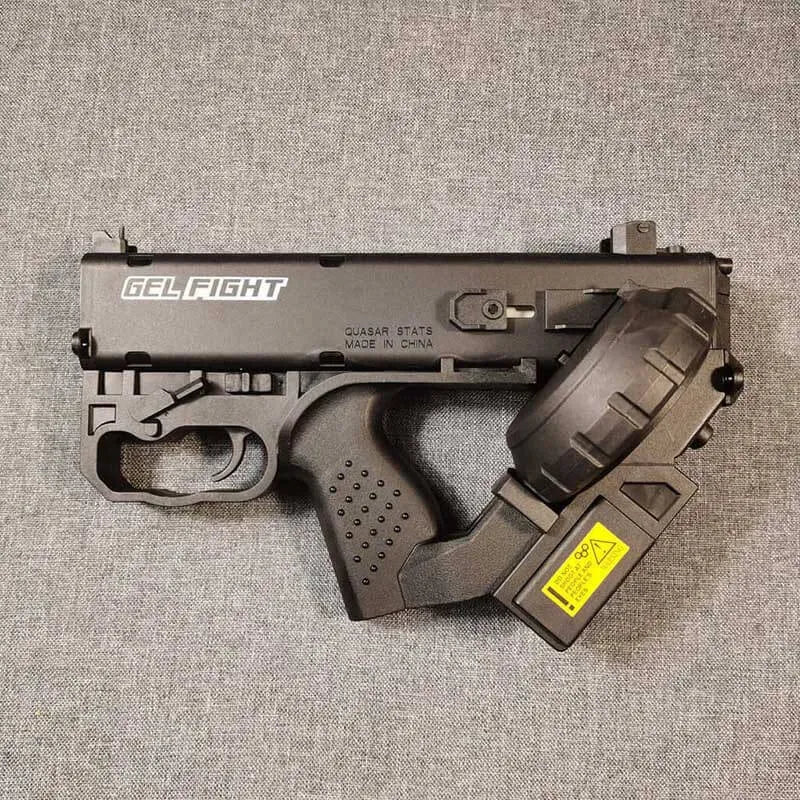 This gel ball blaster is modeled after the Quasar DR-12 revolver from the game Cyberpunk 2077.
