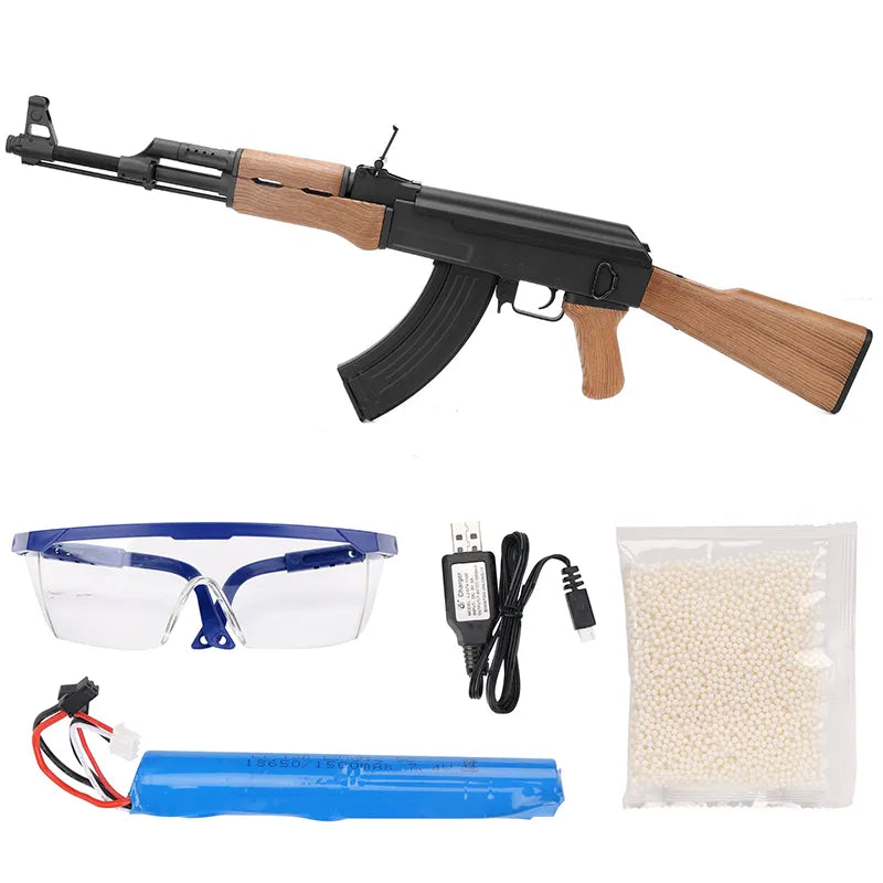 The CYMA AK47 has a full-size body, gel ball magazine, and can be battery or spring-operated.