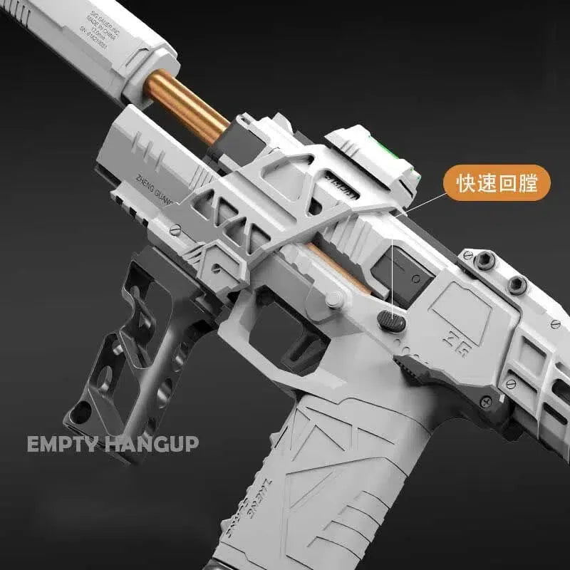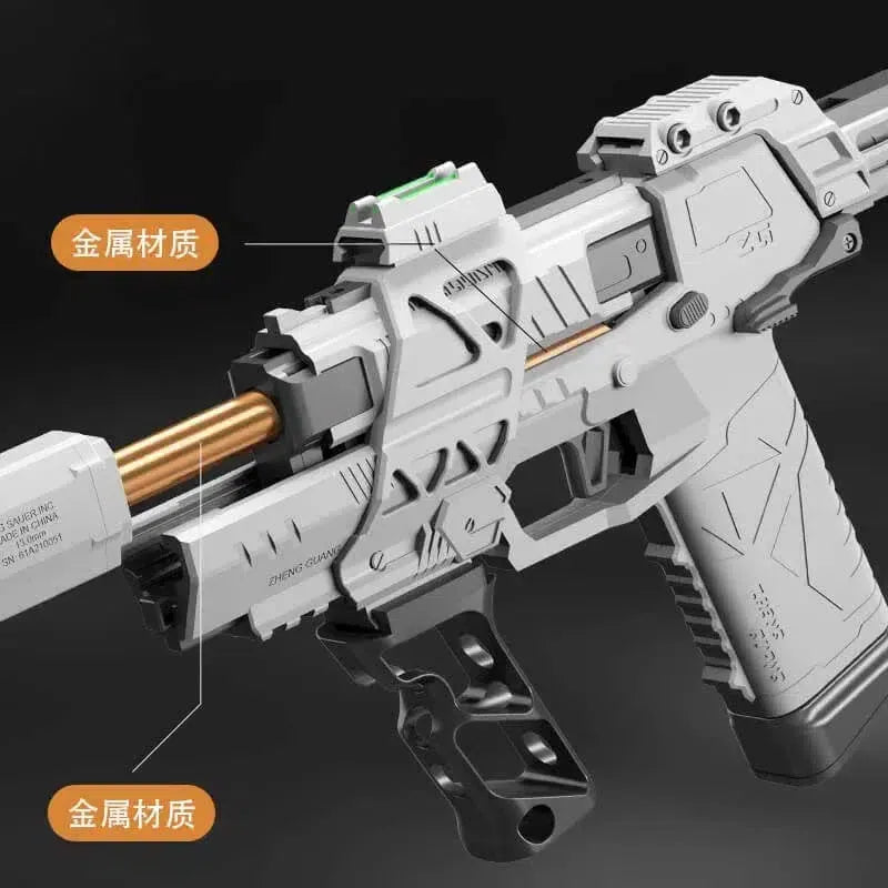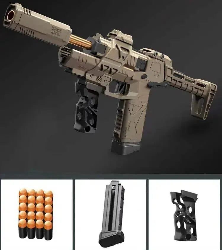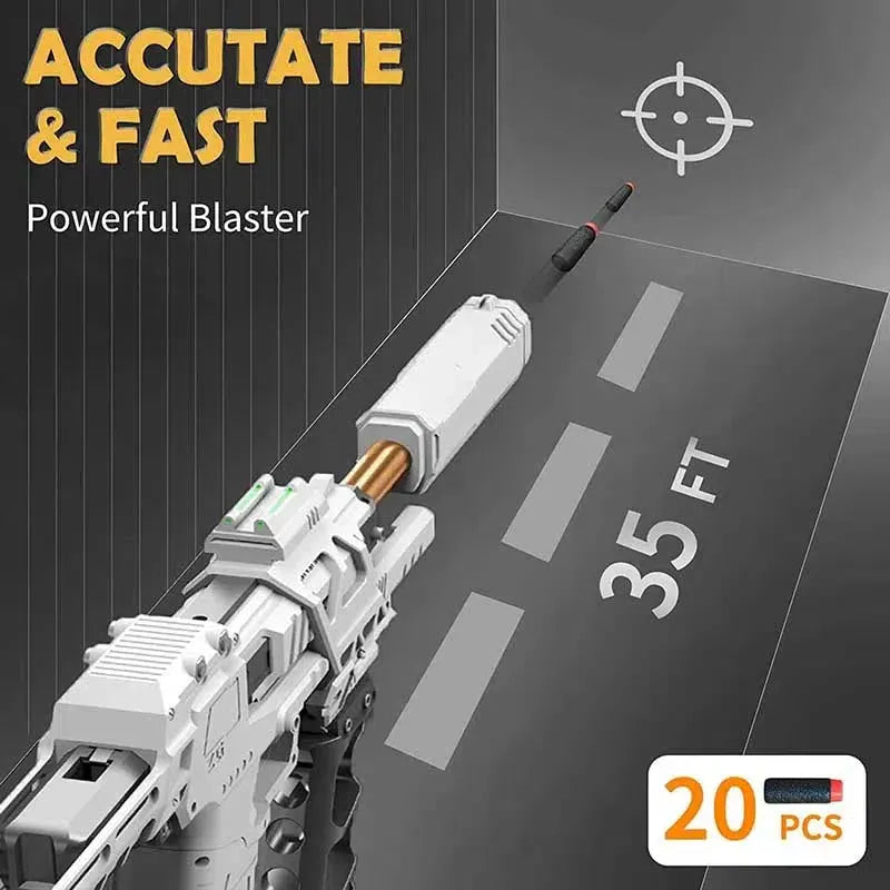 The Custom DIY Gecko 3.0 Tactical Foam Blaster is crafted from durable nylon and provides up to 110 FPS with a range of 25m. It features a last-round hold-open feature and an airtight sealed nozzle with an integrated t-piece for superior power. The blaster also includes a silencer, foregrip, and fiber sight for tactical purposes, and is installed with a 6kg powerful spring. It comes in white, tan, and black and has a mag capacity of 8pcs stefan short darts and works with half-length darts.