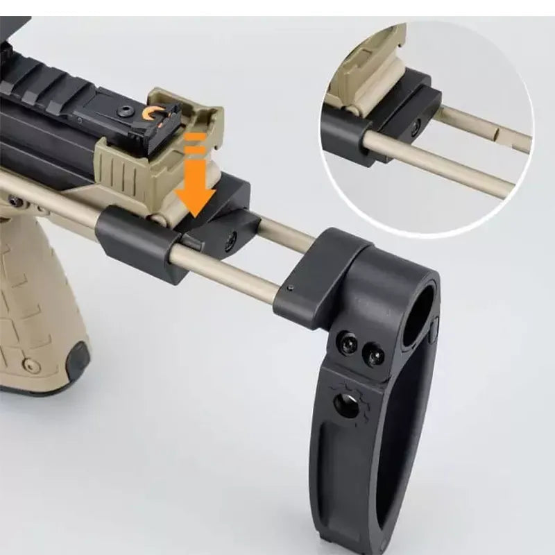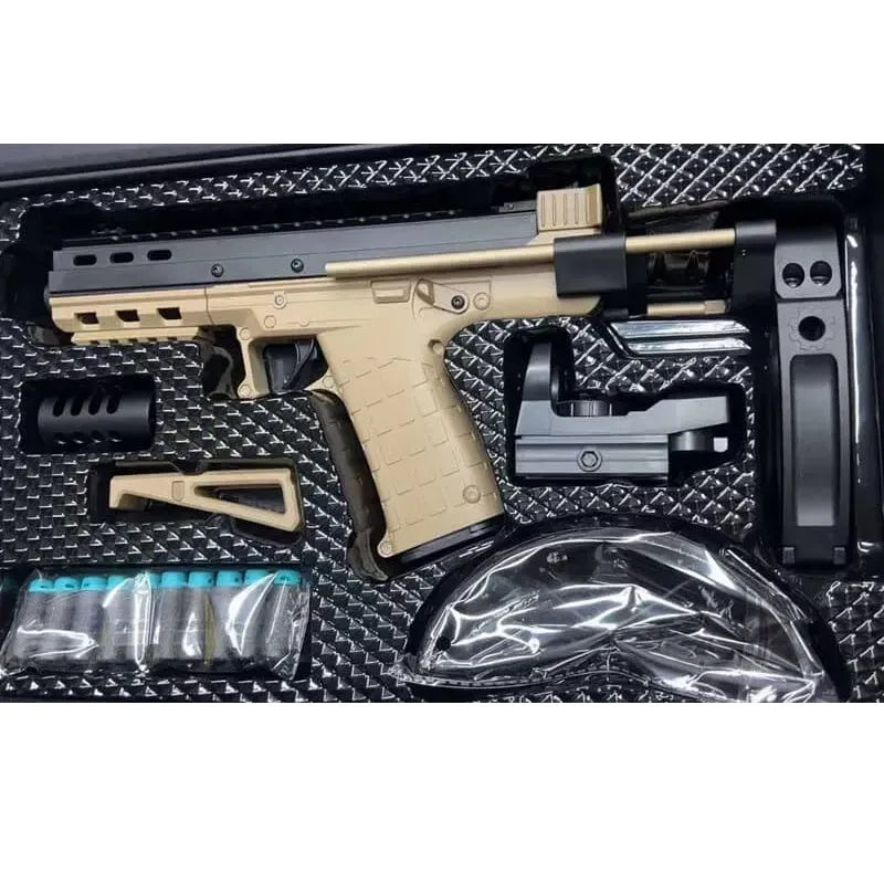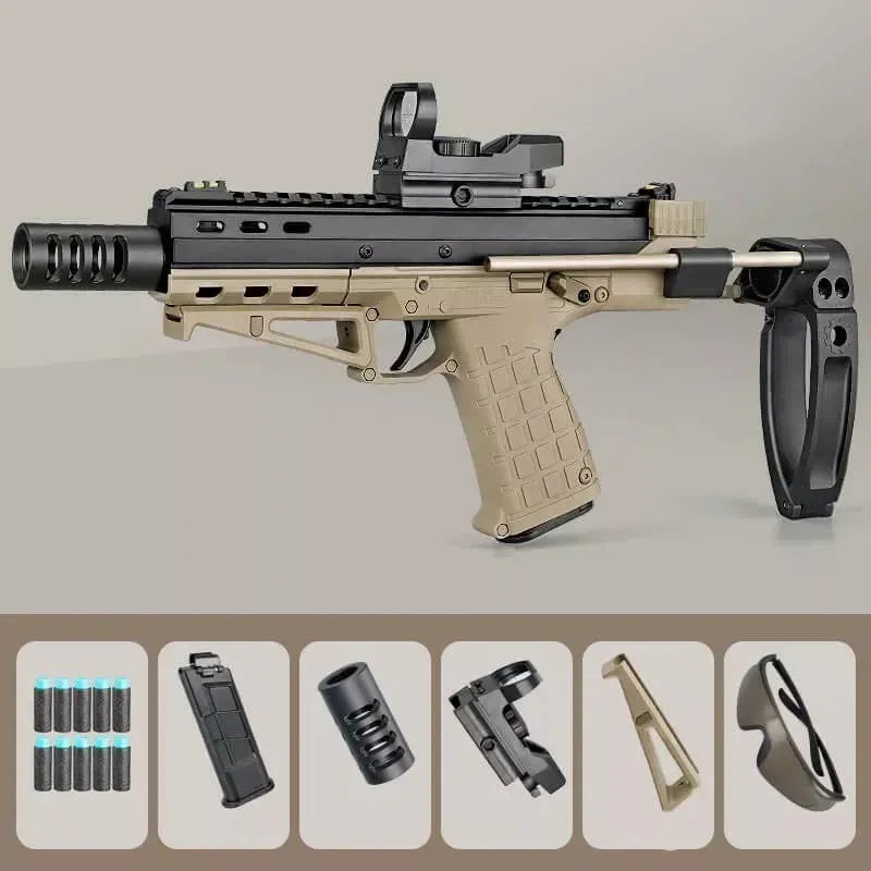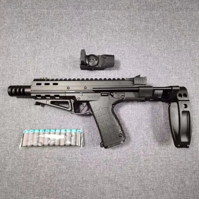 - Tactical style combat Lehui kel tec cp33 foam dart blaster with muzzle brake, butt stock, foregrip and holographic sight.