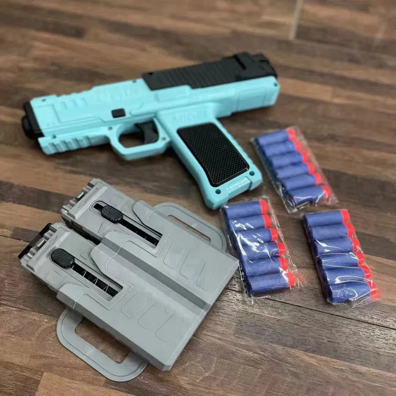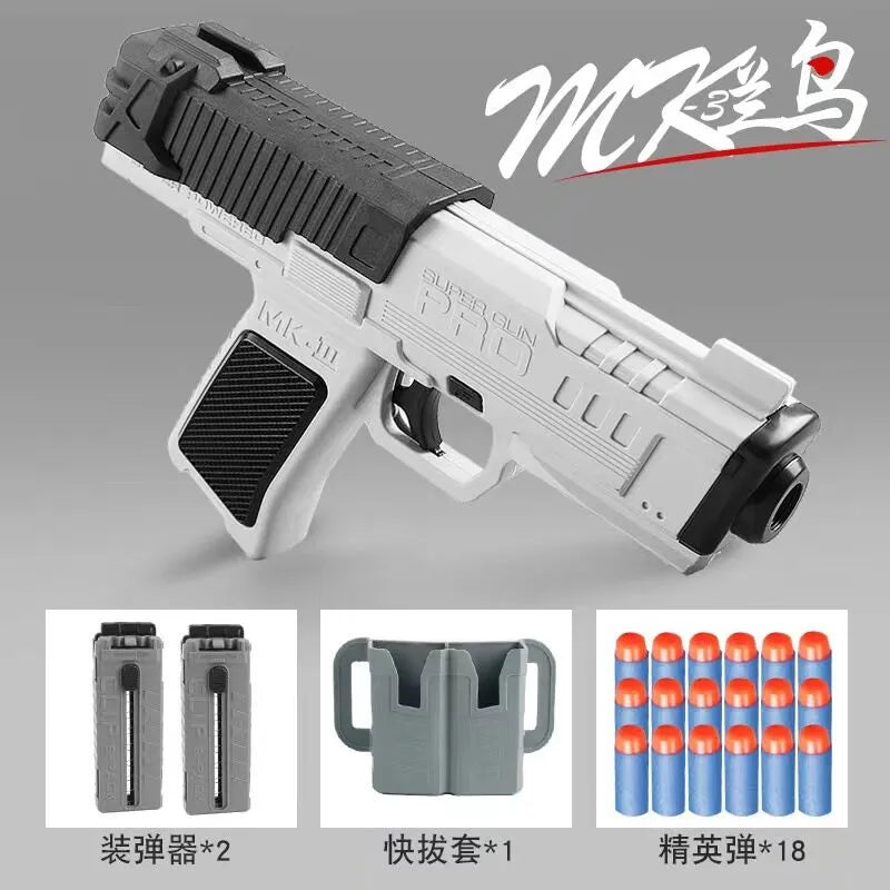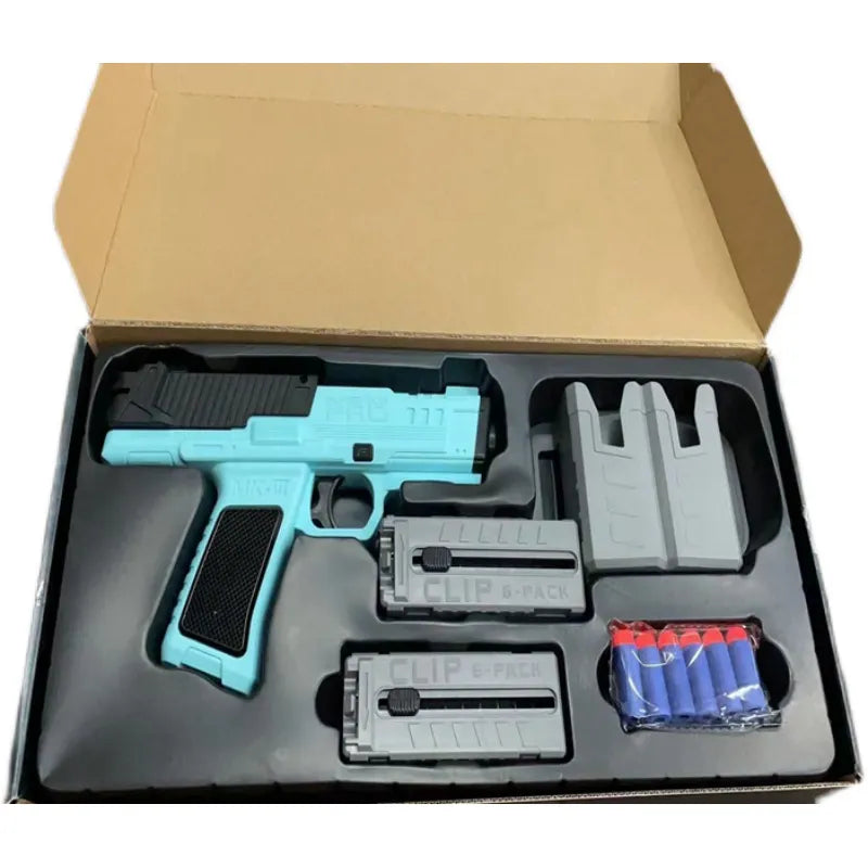 The MK-3 Clip Fed Foam Darts Blaster is the perfect choice for Nerf battles. Featuring a slide pull back reload action, it's capable of rapid ammo reloading via a hopper magazine. The blaster also uses Stefan short darts and can be upgraded to achieve greater power. Enjoy fast, intense battles!