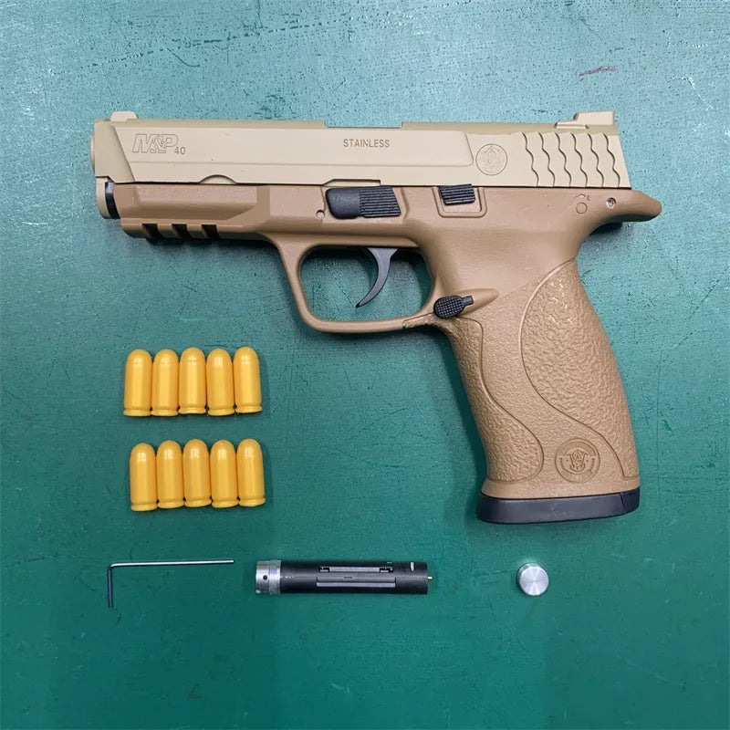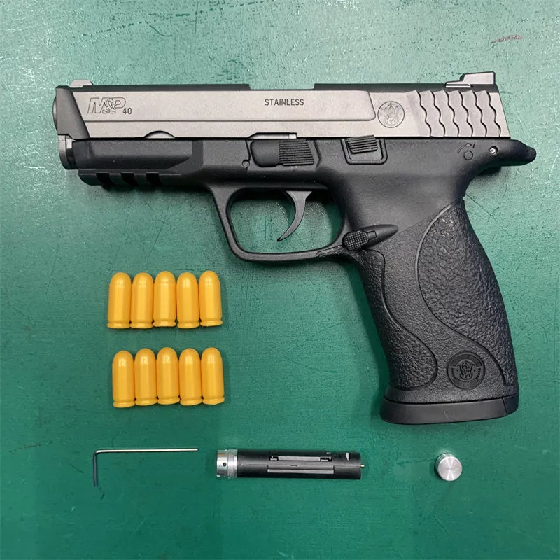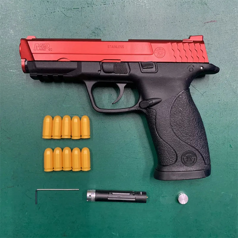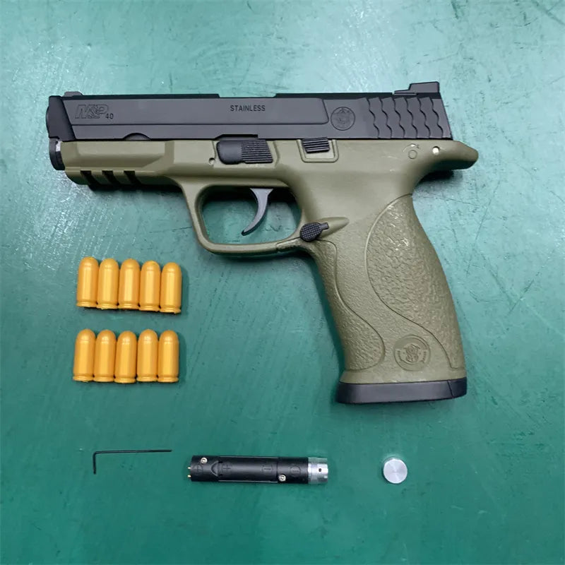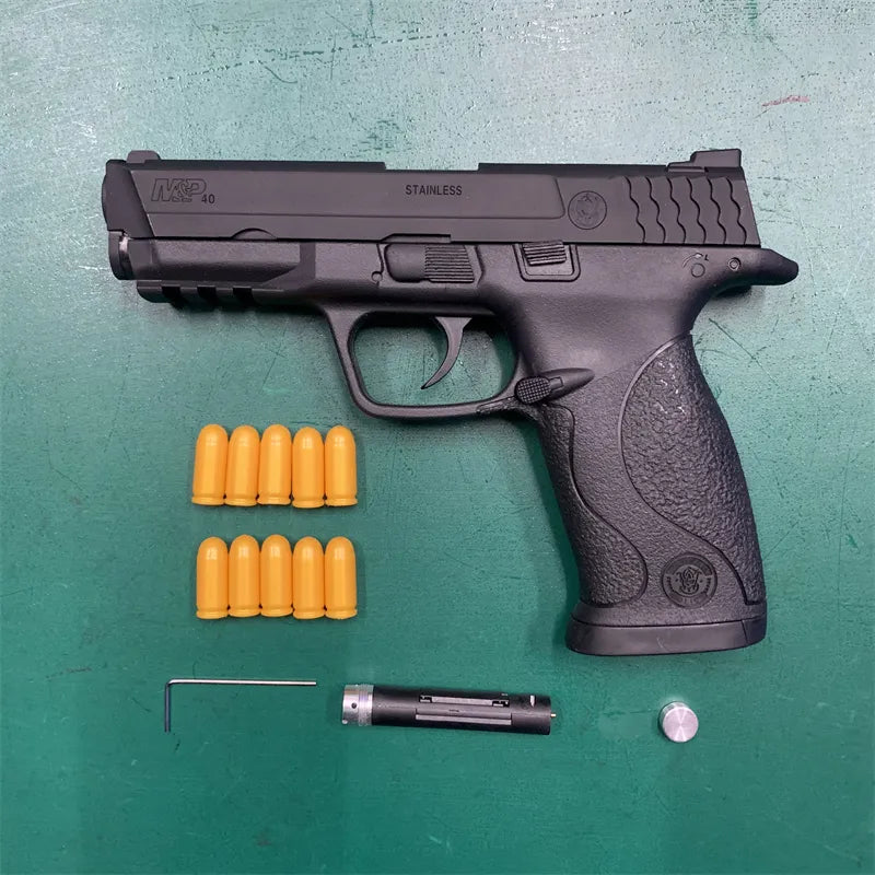 - The M & P 40 laser tag blaster is a blackback toy gun, which means the slide moves back when you Press the trigger.