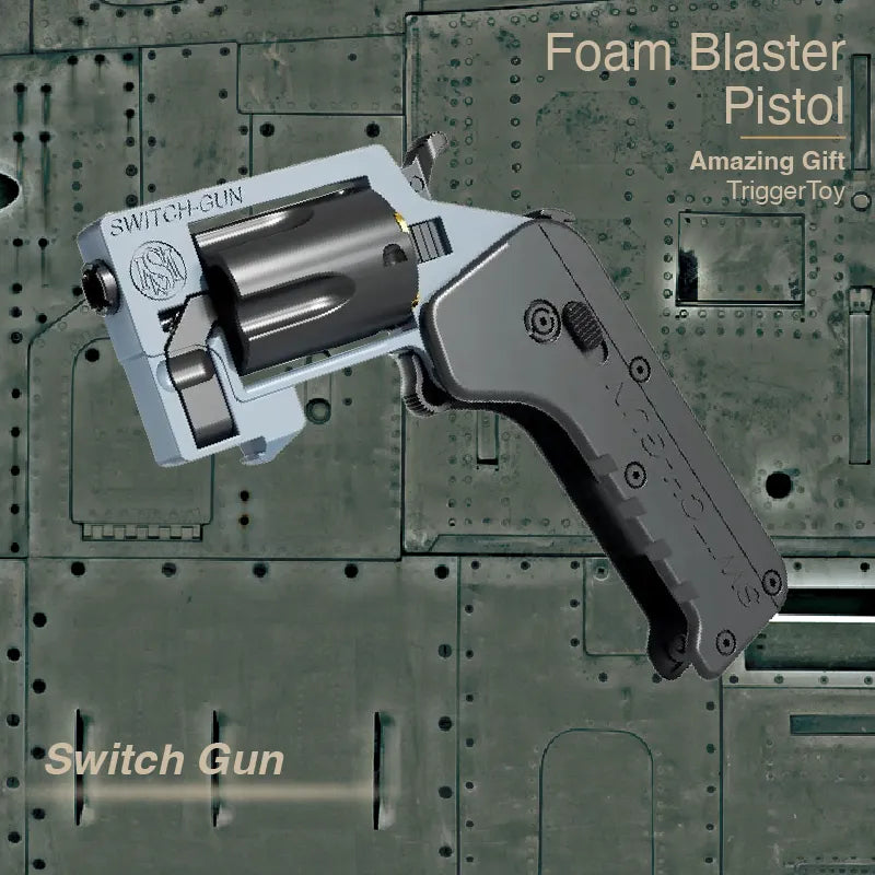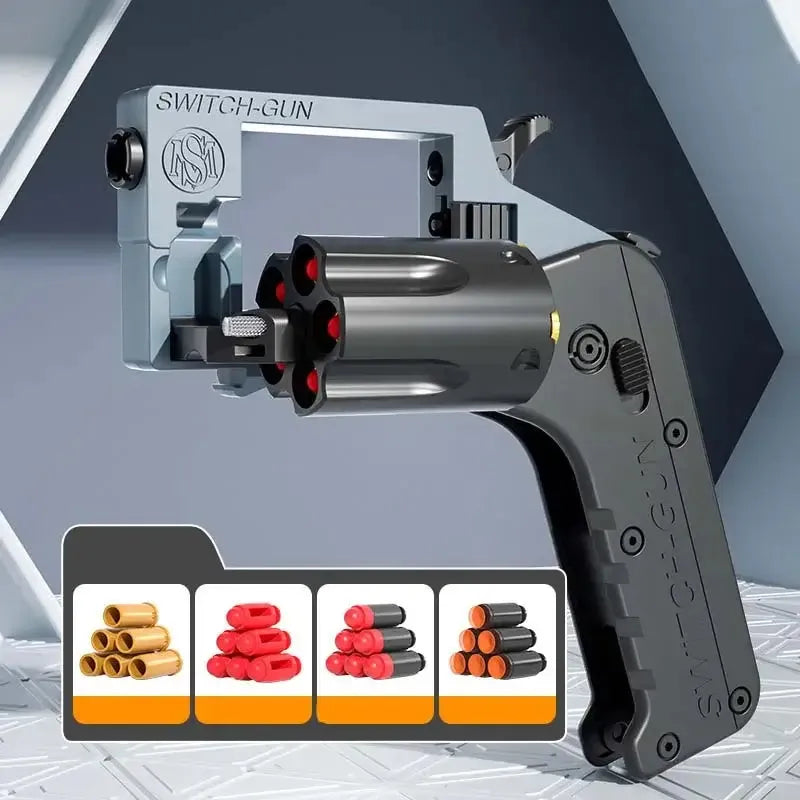- This switch gun style revolver toy blaster can be folded in a compact size.