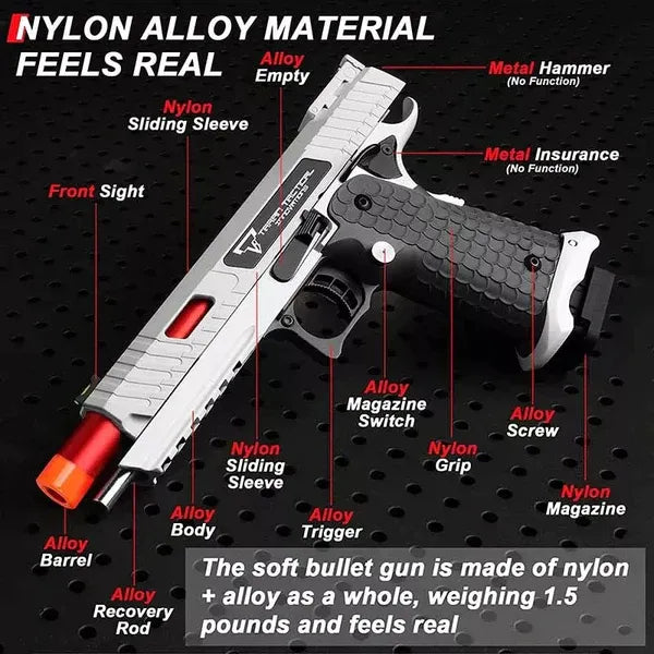 - Built with metal parts like inner barrel, safety, trigger, hammer, mag release, recoil rod, and hold-open hanger.