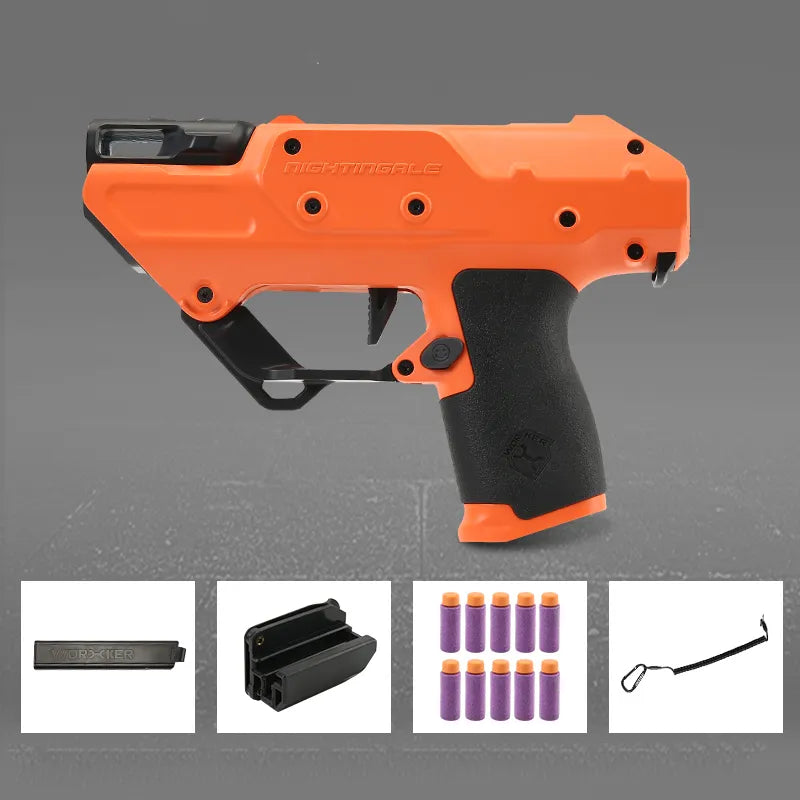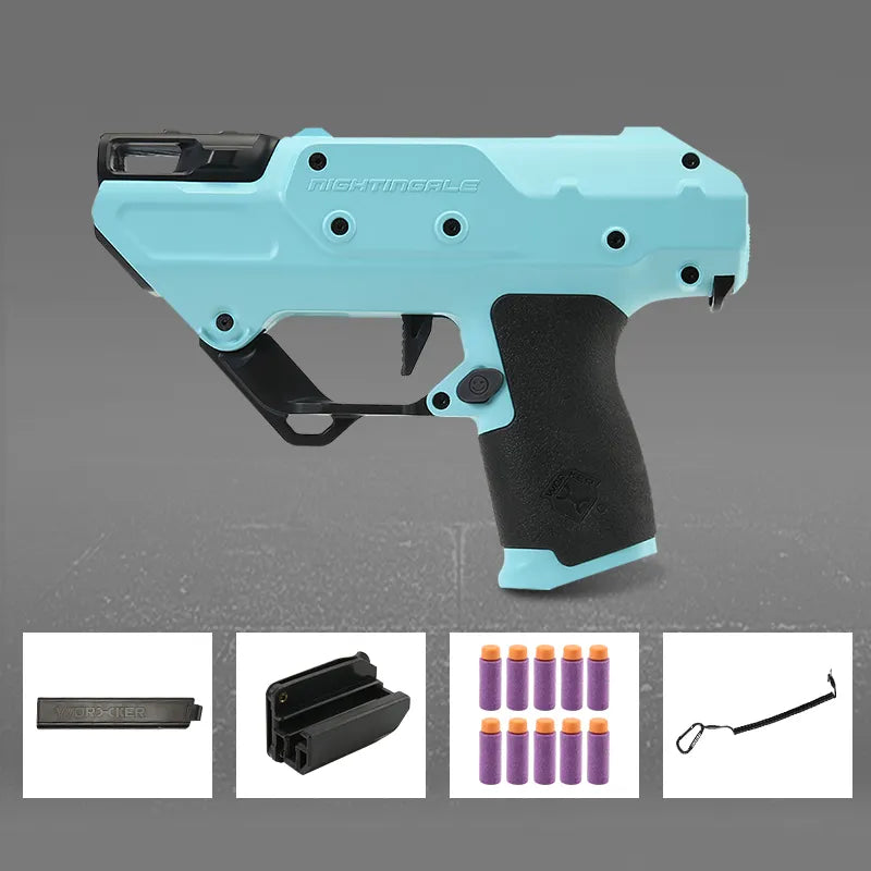 - Nightingale Blaster with FULL AUTO pistol design. Small flywheel design and 15 rounds of mini tilted Talon clip(Not compatible with the original tilted Talon clip).