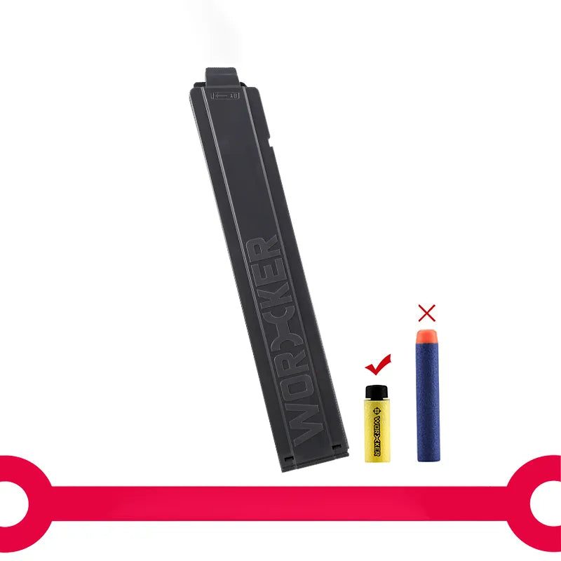This worker phoenix 2.0 blaster is powered by six flywheels, which has adjustable speed, quickly release, and made with an upgraded motor. The butt stock is also a battery compartment and is extendable. Ergonomically designed receiver grip, made with soft rubber sandblasting TPR. Compatible with the talon mag and Stefan short darts.